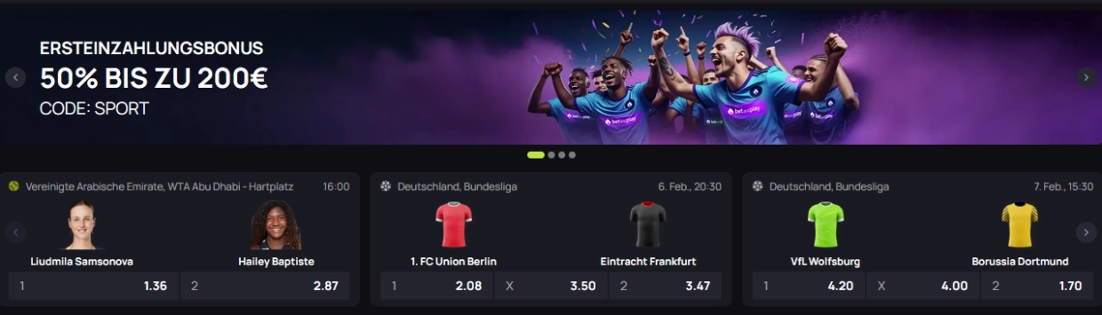 BetandPlay wirkt moderner und setzt Sportwetten sichtbar als Kernbereich. Du landest schnell im Wettbereich, mit klarer Trennung zwischen Sport und Casino.